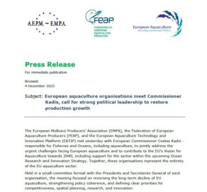The European Molluscs Producers’ Association (EMPA), the Federation of European Aquaculture Producers (FEAP), and the European Aquaculture Technology and Innovation Platform (EATIP) met yesterday with European Commissioner Costas Kadis responsible for Fisheries and Oceans, including aquaculture, to jointly address the urgent challenges facing European aquaculture and to contribute to the EU’s Vision for Aquaculture towards 2040, including support for the sector within the upcoming Ocean Research and Innovation Strategy. Together, these organisations represent the entirety of the EU aquaculture sector.